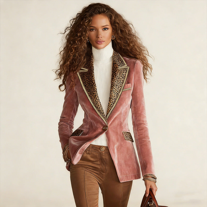 Retro And Fashionable Leopard Print Color-block Collar Velvet BlazerRetro And Fashionable Leopard Print Color-block Collar Velvet Blazer- Regular price