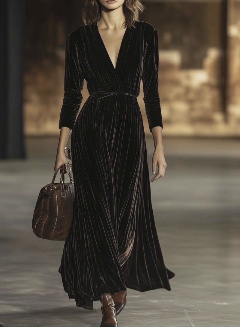 【24-hour shipping out】V-Neck Retro Solid Color Belted Velvet Long-Sleeved Maxi Dress
