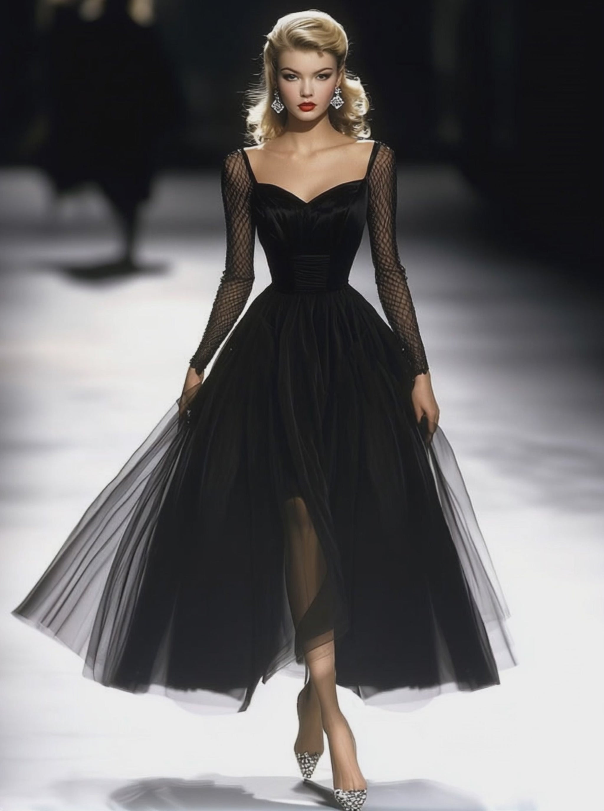 This dress features sophisticated details that enhance its vintage appeal, such as an elegant, flowing cut and subtle embellishments that add texture and depth to the design. Whether you're attending a formal event, a gala, or an elegant dinner, this black tulle maxi dress is sure to impress.