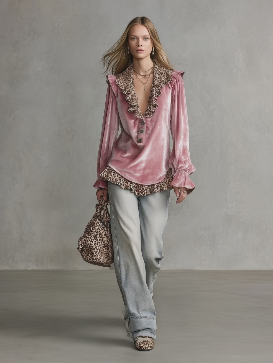 A retro V‑neck leopard print ruffled‑hem velvet shirt blends luxurious texture with playful vintage flair. The soft velvet fabric enhances the leopard print’s depth and sheen, creating a rich visual effect that feels both bold and elegant. The V‑neckline adds a flattering touch, while the ruffled hem introduces gentle movement and a feminine finish—ideal for balancing the wild energy of the print.