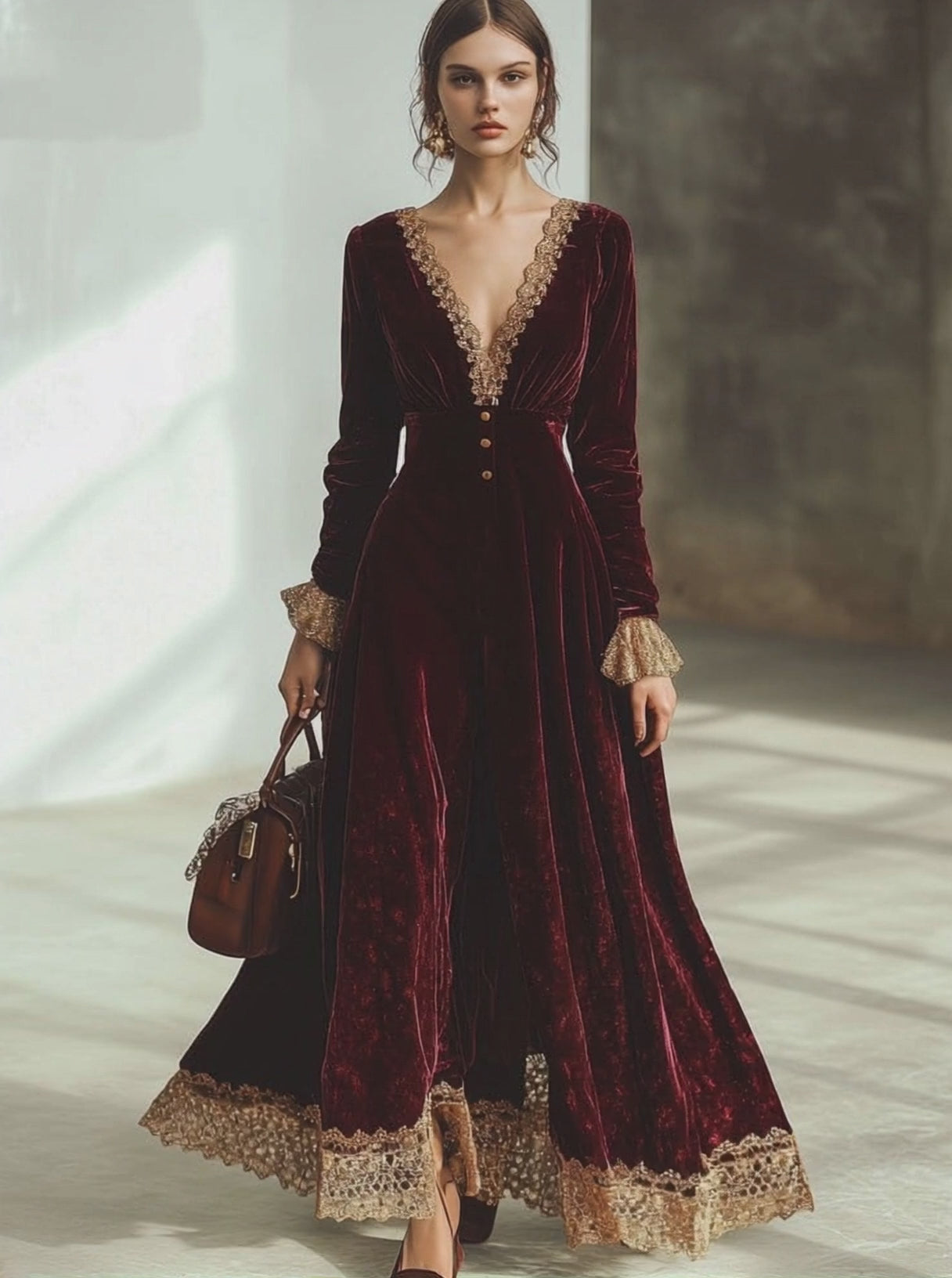 Vintage Ankola Red Velvet Lace V-neck Long Sleeve Maxi Dress