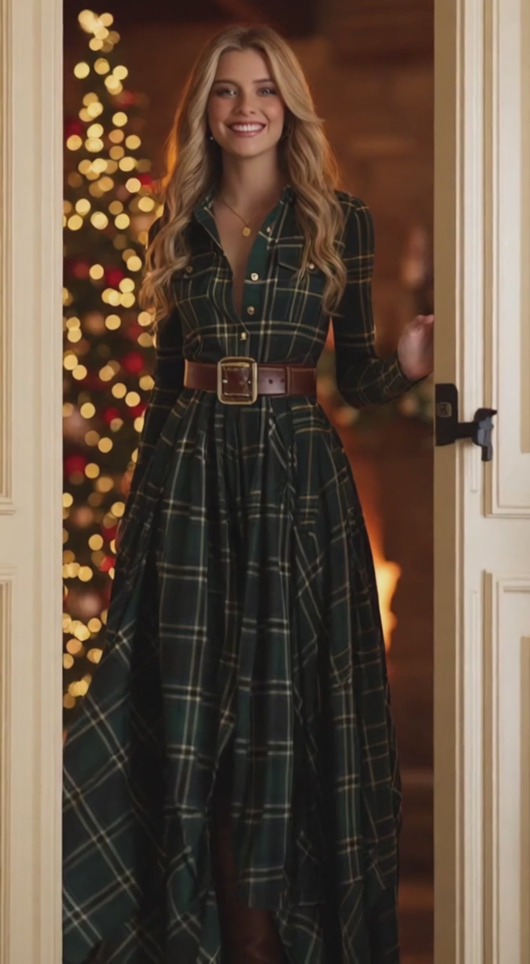 This vintage-inspired ethnic-inspired maxi dress features a lapel design and a reddish-brown plaid pattern, seamlessly blending retro charm with warm ethnic flair for a timeless and striking look. The slim fit enhances elegance, while the rich plaid pattern adds a layered, nostalgic feel.