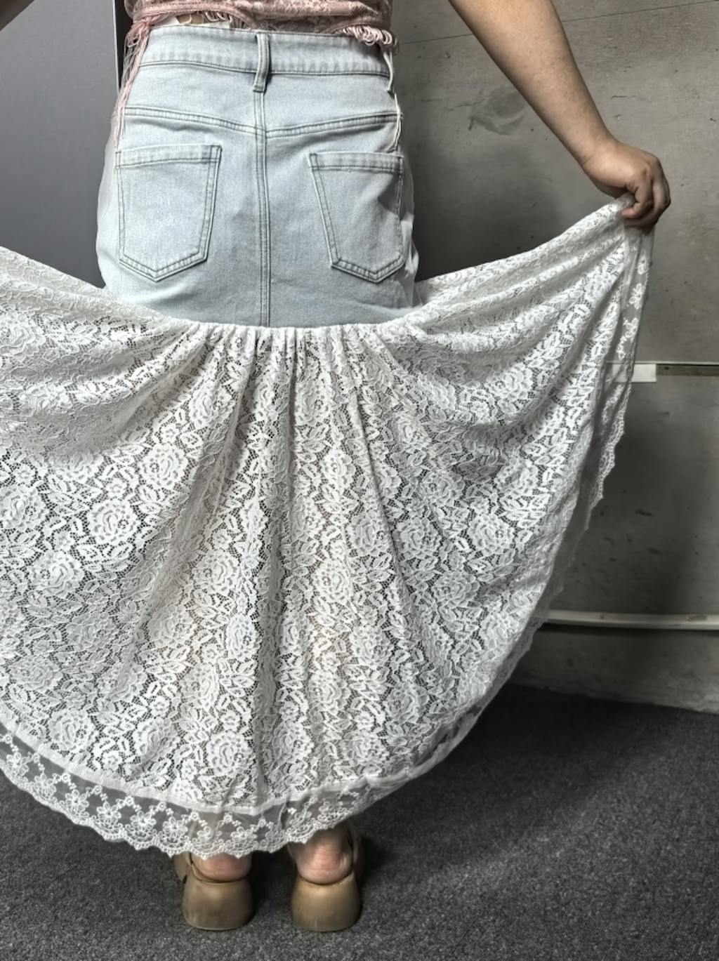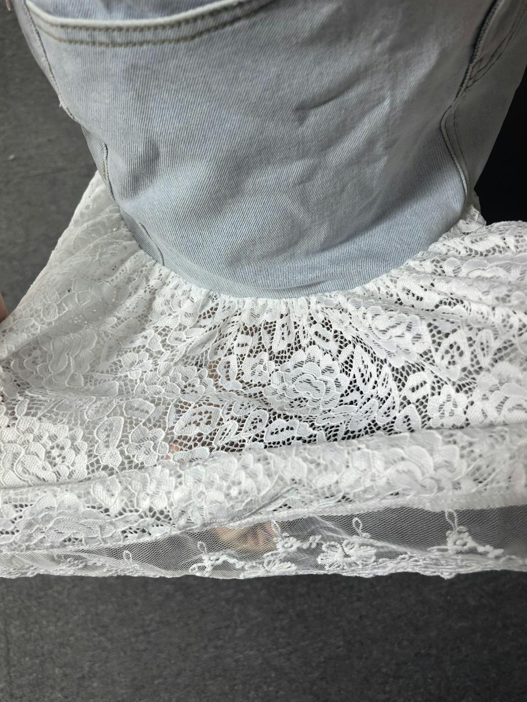 This romantic and fashionable short front and long back lace patchwork denim skirt offers a unique blend of edgy denim and delicate lace for a truly standout piece. The high-low hemline creates a dynamic silhouette that adds movement and drama, while the lace patchwork introduces a touch of romance and intricacy to the design. The rugged appeal of denim paired with the softness of lace captures a perfect harmony between casual and elegant styles.